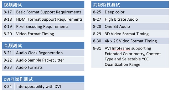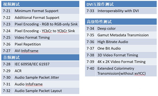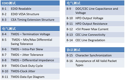 Sink测试内容:EDID、电气(摆幅、偏移、抖动、阻抗、 DDC/CEC负载电容、5V供电等)、协议(数据结构、视频、音频等)、DVI互通性、高级特性(深色位、高比特率音频、3D、4Kx2K等)。