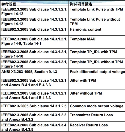 针对十兆以太网接口的电气特性测试,包括MAU Template模板测试、TP_IDL Template模板测试、Link Pulse Template模板测试、Peak Differential Voltage峰值差分电压测试Harmonic Content谐波成分测试、Output Timing Jitter抖动测试等测试项目。
