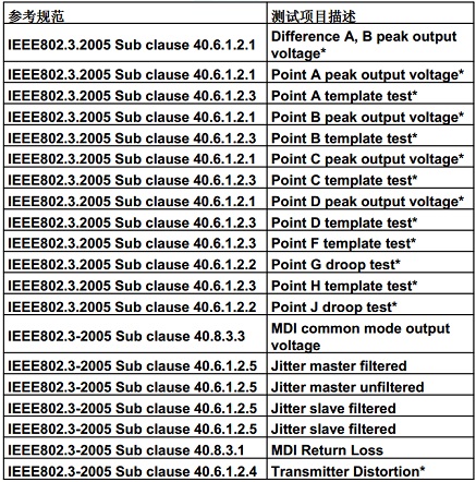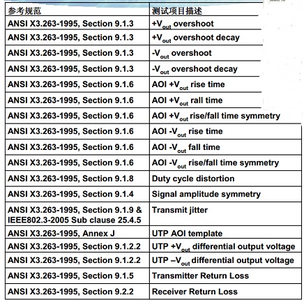 针对百兆以太网接口的电气特性测试,包括差分输出电压测试、信号振幅对称性测试、波形过冲测试、上升时间和下降时间测试、占空比失真测试、总传输抖动测试、AOI眼图模板测试等测试项目。