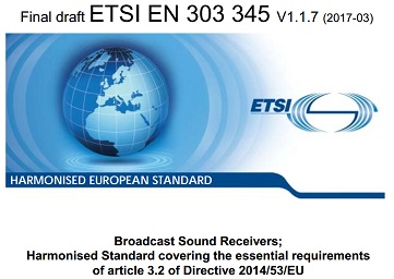 欧盟新的无线设备指令RED将电视机、收音机等广播接收设备纳入范围。EN303345是针对音频广播接收机的测试标准,覆盖AM、FM、DAB、DRM四种不同的调制方式。